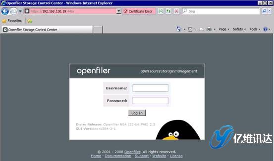 Openfiler 鏡像系統(tǒng)配置當(dāng) Openfiler 系統(tǒng)安裝并重啟完成后,對(duì)系統(tǒng)所有后續(xù)的配置過程,都是以 Web 方式配置完成的。這種全部基于 Web 的系統(tǒng)配置方式,使得配置過程變得更加簡易,同時(shí)也帶來了良好的用戶體驗(yàn)。首先打開瀏覽器,輸入地址:https://IP:446。注意,此處輸入的 IP 地址為在系統(tǒng)安裝時(shí)所配置的固定 IP 地址。然后使用系統(tǒng)初始默認(rèn)的用戶名和密碼進(jìn)行登陸。用戶名為 openfiler,密碼為 password。系統(tǒng)初始的用戶名和密碼可以在第一次登入系統(tǒng)后進(jìn)行重新設(shè)置。如圖所示。