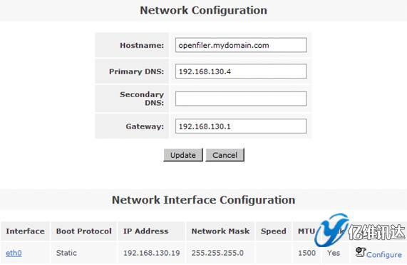 在系統(tǒng)菜單“System”菜單下的“Network Access Configuration”區(qū)域,配置允許訪問 Openfiler 系統(tǒng)的安全訪問控制列表。值得注意的是只有加入到 Openfiler 的網(wǎng)絡(luò)訪問控制列表中的網(wǎng)絡(luò)或者主機(jī)地址,才允許訪問 Openfiler 系統(tǒng)所提供的虛擬存儲(chǔ)服務(wù)。在網(wǎng)絡(luò)訪問控制列表中,既可以配置網(wǎng)段地址也可以配置單個(gè)主機(jī)地址。在本例填入 192.168.130.0 網(wǎng)段,設(shè)置類型為“Share”方式,添加完成后點(diǎn)擊“Update”完成系統(tǒng)配置更新。如圖