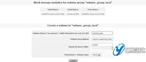 接下來在右側(cè)的“Volumes section”區(qū)域選擇“Add Volume”選項(xiàng),在剛剛創(chuàng)建好的卷組“volume_group_iscsi”中新創(chuàng)建一個(gè) iSCSI 卷。注意在屬性“Filesystem / Volume type”中設(shè)置屬性值為“iSCSI”。如圖 25 所示。
