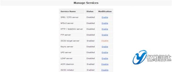 當(dāng) iSCSI 卷創(chuàng)建完成后,接下來是開啟“iSCSI target server”系統(tǒng)服務(wù)。點(diǎn)擊“Services”菜單,在右側(cè)的“Services section”區(qū)域選擇“Manage Services”。然后將系統(tǒng)服務(wù)列表中的“iSCSI target server”設(shè)置為“Enabled”狀態(tài),從而使得系統(tǒng)能夠?qū)ν馓峁┗?iSCSI 協(xié)議的虛擬存儲(chǔ)服務(wù)。如圖