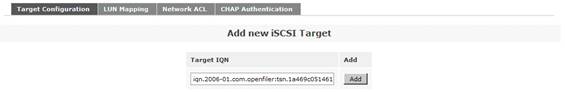 接下來是添加一個(gè) iSCSI Target。首先點(diǎn)擊菜單“Volumes”,然后在右側(cè)的“Volumes section”區(qū)域中選擇“iSCSI Targets”。在“Target Configuration”子菜單中的“Add new iSCSI Target”區(qū)域,選擇列出的“Target IQN”。最后點(diǎn)擊“Add”按鈕,從而添加了一個(gè) iSCSI Target。注意,此處的 Target IQN 信息在后面的對(duì) ESX 服務(wù)器的存儲(chǔ)配置過程中會(huì)用到。如圖